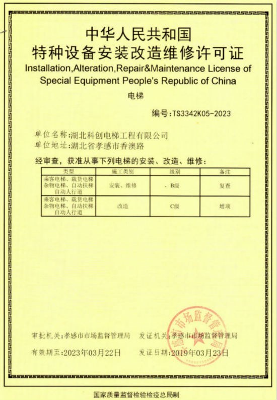 2019年3月23日通过国家特种设备主管部门的4年一度资质年审及增项评审,公司获得的电梯安装维修B级及电梯改造C级资质,成为集电梯销售、安装、维保、改造于一体的全方位专业电梯公司。