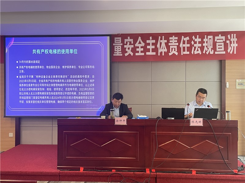 为认真贯彻落实国家市场监督管理总局第73号令《特种设备生产单位落实质量安全主体责任监督管理规定》,5月10日,孝感市电梯协会特邀孝感市市场监督管理局特设科陈光明科长,开展电梯安装企业落实质量安全主体责任的法规宣讲。讲座由孝感市电梯协会会长徐仲平主持,采取线下集中培训和线上直播学习相结合的方式开展,各市州县市场监管部门、同业协会和各地电梯企业从业人员近400人参加了本次宣讲学习。