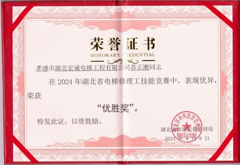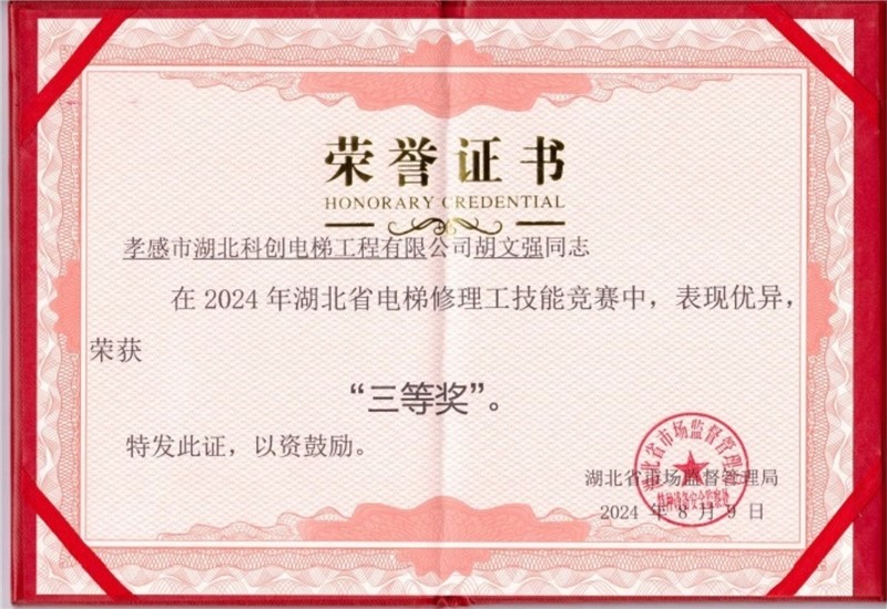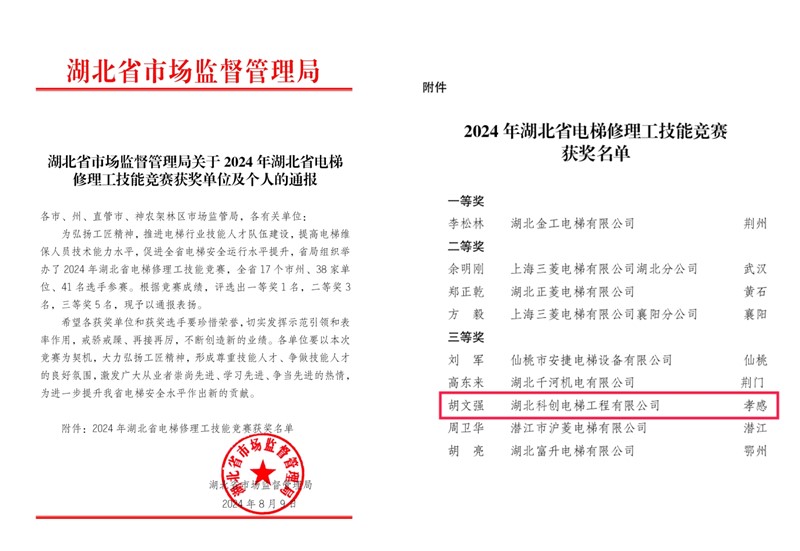 全省17个市州,38家单位,共推选出了41名电梯修理行业高手参与本次角逐,经孝感市市场监管局、孝感市电梯协会推选的2名选手,经过两天三个实操比赛项目的同场较量、比武切磋,来自湖北科创电梯工程有限公司的胡文强凭借其精湛的技艺和出色的表现,以总分90.33分夺得大赛第7名,荣获“2024年湖北省电梯修理工技能竞赛技”三等奖,湖北宏诚电梯工程有限公司的苏正潮荣获优胜奖,为孝感争光。