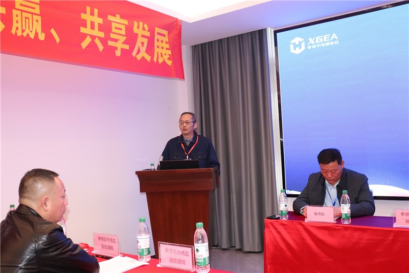 湖北特检院孝感分院副院长汪浩明致辞,汪院长要求协会会员企业,加强自身建设,提高维保质量,加大培训力度,规范从业行为。